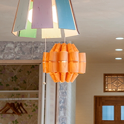 ガラスやホーロー、ビーズ、アンティークなど、コーディネートの参考になる多彩な照明を散りばめています。